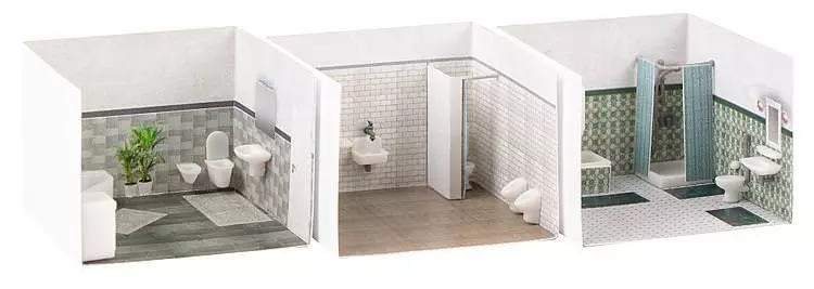 Ausgestaltungsset bestehend aus drei Badeinrichtungen unterschiedlicher Jahrzehnte. Deko und Armaturen beiliegend. Badeinrichtung aus den 2000er Jahren mit Eckbadewanne, WC, Bidet und Waschbecken zur Wandmontage, Handtuch-Heizkörper und Waschmaschine. Badeinrichtung aus den 1970er Jahren mit freistehender Badewanne, Eckduschkabine, Stand-WC, Waschbecken, Boiler und Heizkörper. Werkstatt-Sanitäreinrichtung mit einem Stand-WC mit Spülkasten, 2 Urinalen, Handwaschbecken, Malerwaschbecken und Spind. Die Badezimmereinrichtungen passen zur »Gebäude-Inneneinrichtung«, Art. 180545.