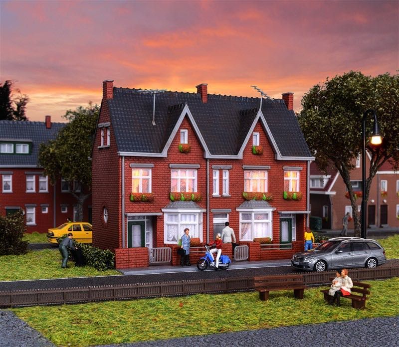 Bausatz. Dieses Doppelhaus ist ein typisches Vorstadtgebäude. Maße: L 14,8 x B 10,5 x H 10,5 cm. Schwierigkeitsgrad: 2 (Fortgeschrittene).