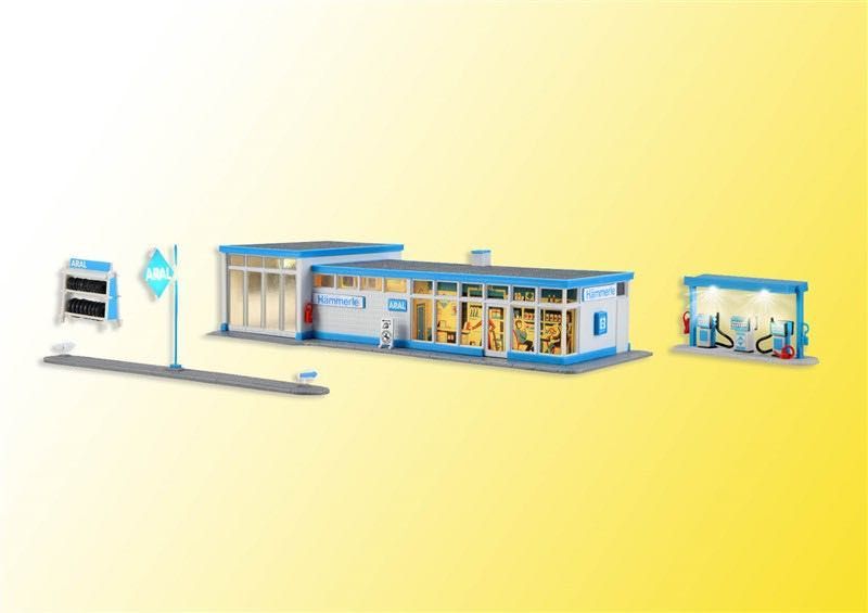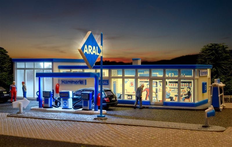 Funktionsbausatz. Die Tankstelle ist im Verkaufsraum mit warmweißen LEDs und in der Reparaturwerkstatt mit weißen LEDs ausgestattet. Zusätzlich sind das ARAL-Schild und das Dach über den Zapfsäulen beleuchtet. Passend dazu erhältlich ist die beleuchtete Zapfsäule von Viessmann Art. 1364 und Art. 5131 Hebebühne, bewegt. Maße: L 19,5 x B 9 x H 4,5 cm. Schwierigkeitsgrad: 2 (Fortgeschrittene).