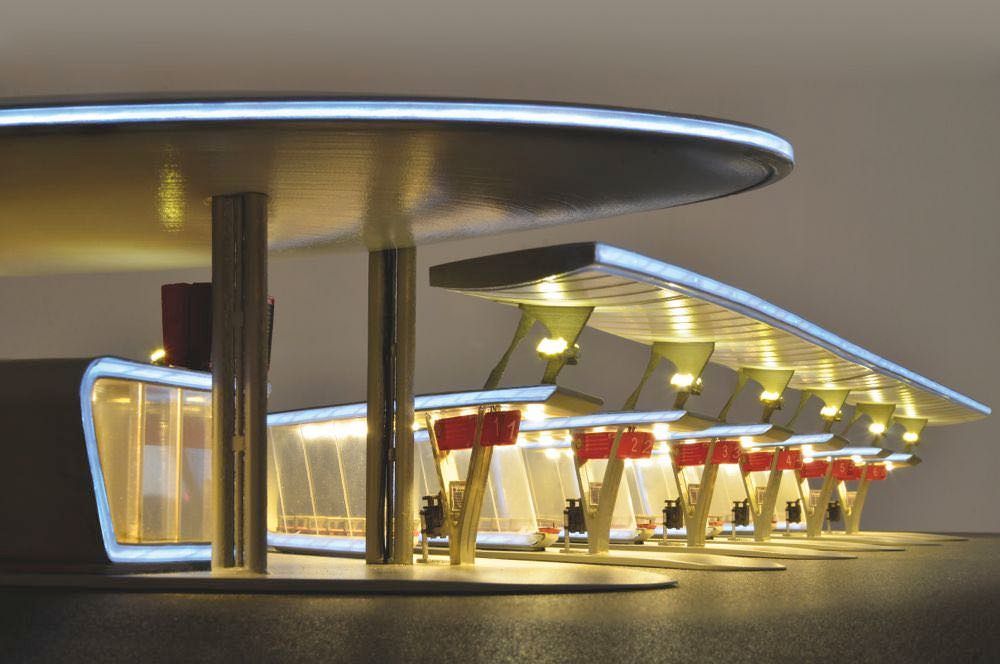Funktionsbausatz. Diese originalgetreue Form-Neuheit setzt durch ihre ausgefeilte Beleuchtungstechnik neue Maßstäbe. Die integrierten Lichtbänder und 7 LED-Reflektoren unterstreichen die markante Architektur dieses besonderen Bauwerks. 6 Haltestationen und der kubische Warteraum mit ellipsenförmiger Überdachung prägen dieses Modell. Kompatibel zum Faller Car System. Passend dazu: Viessmann Art. 6338 H0 Reflektor, LED weiß und Art. 6339 H0 Deckenstrahler LED weiß, 7 Stück. Maße: L 84,7 x B 32,7 x H 9,6 cm. Schwierigkeitsgrad: 3 (Profis).
