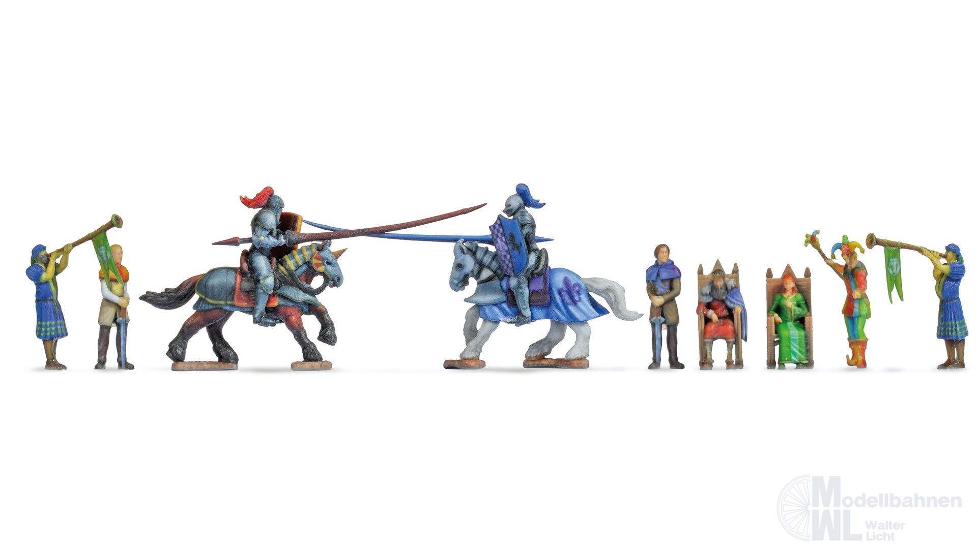 Der Turnierplatz, das Tor mit Loge und die Tribüne sind als Laser-Cut Bausätze ausgeführt. Die Elektronik für die Bewegung ist anschlussfertig aufgebaut und kann an einen üblichen 16-V-Modellbahn-Trafo angeschlossen werden. Geeignet für Gleich- und Wechselstrom. Zum Ausgestalten sind neun hochdetaillierte, farbig gedruckte Figuren enthalten.