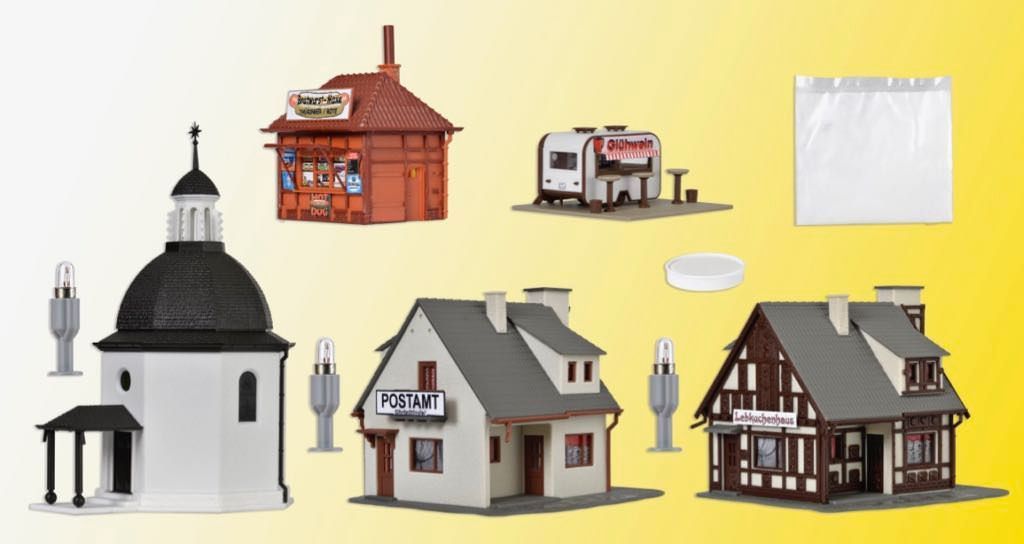 Das Weihnachtsdorf passt hervorragend auf Modellbahnanlagen mit Winterstimmung. Oder gestalten Sie mit Ihren Kindern und Enkeln im Rahmen vorweihnachtlicher Bastelabende ein festliches Diorama. Die Häuser sind auch als Dekoration auf dem Fenster- oder Kaminsims eine Augenweide. Das Dorf besteht aus der Stille-Nacht-Gedächtniskapelle, einem Postamt Christkindl, Glühweinstand, Lebkuchenhaus und Bratwurst-Maxe. Der Kapelle, dem Postamt und dem Lebkuchenhaus liegt jeweils eine Sockelbirne für die Innenbeleuchtung bei. Außerdem ein Tütchen Kunstschnee zur Gestaltung der winterlichen Atmosphäre. Maße: Kapelle L 11 x B 8 x H 16 cm, Postamt L 10,5 x B 9,7 x H 8,3 cm, Lebkuchenhaus L 10,5 x B 9,7 x H 8,3 cm, Bratwurst-Maxe L 6 x B 6,5 x H 7,8 cm, Glühweinstand L 6,2 x B 6,3 x H 3,3 cm.