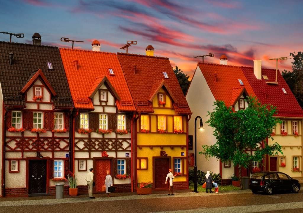 Mit den Bausätzen der Vollmer Bahnhofstraße 9 – 19 können Sie einen kompletten Straßenzug mit Wohn-, Geschäfts- und Fachwerkhäusern gestalten. Bereits mit 4 Bausätzen schaffen Sie sich eine preiswerte und abwechslungsreiche Häuserfront. Maße: L 5,2 x B 8,2 x H 13 cm.