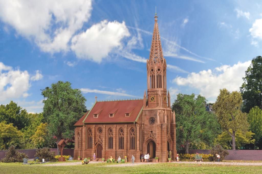 Das Vorbild dieses Vollmer-Modells kann auf eine bewegte Vergangenheit zurückblicken. Bereits im Jahr 1235 soll auf dieser Anhöhe am westlichen Neckarufer eine Kirche gestanden haben. Ihr folgte 1470 zunächst ein Neubau im gotischen Stil, der Mitte des 19. Jahrhunderts durch eine neugotische Kirche ersetzt wurde. Nach der fast völligen Zerstörung im 2. Weltkrieg wurde die Kirche schließlich 1954/55 wieder aufgebaut, so dass sich ihr Äußeres heute kaum von der neugotischen Vorgängerin unterscheidet. Passend zur Kirche gibt es die Freitreppe Art. 43738. Maße: L 30 x B 13 x H 39 cm.