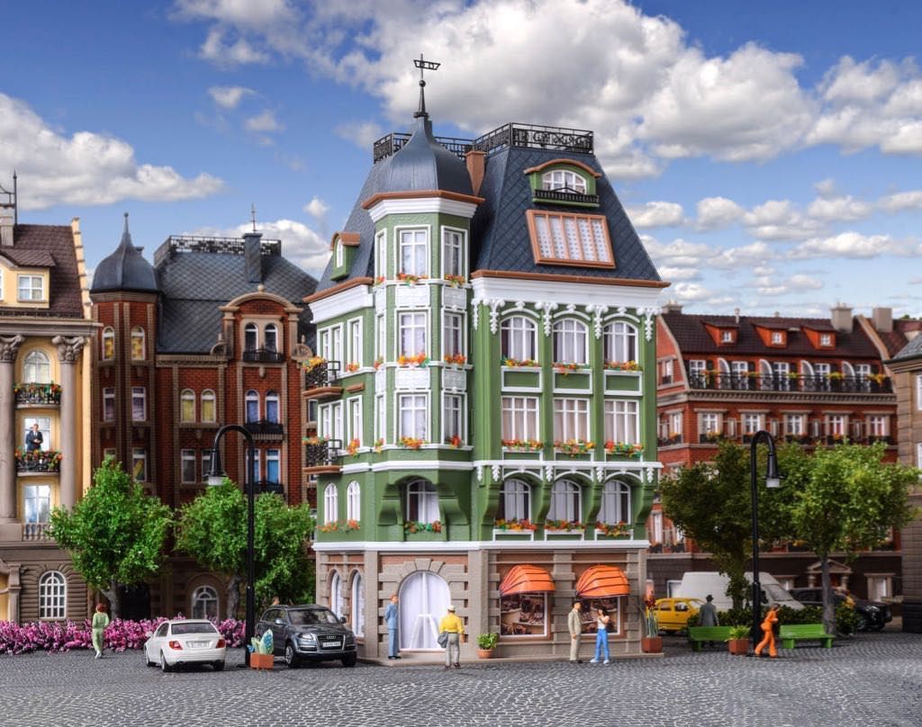 Dieses Modell ist so konstruiert, dass jede Seite eine Sichtseite darstellt. So können Sie z. B. 2 Häuser direkt nebeneinander stellen und sie wirken doch verschieden. Das Gebäude ist mit vielen Details ausgestattet, z. B. Eisengitterverzierungen, zierlichen Balkonen, Stuckfassaden und vielem mehr. Mit den beiliegenden Blendstücken können Sie eine Seite so verkleiden, dass ein zweiter Bausatz direkt angebaut werden kann. Maße: L 10,5 x B 9 x H 21,2 cm.