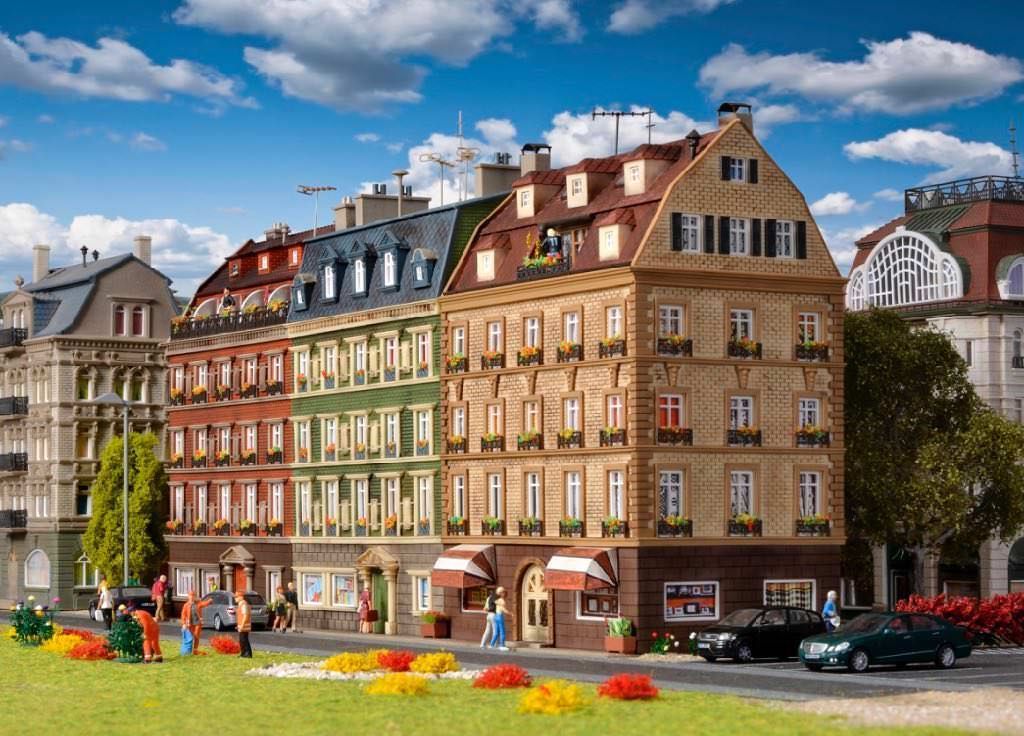 Mit diesem Häuserblock können Sie einen ganzen Straßenzug gestalten. Die Gebäude sind mit vielen Details ausgestattet, z. B. Eisengitterverzierungen, zierlichen Balkonen, Dachterrassen und vielem mehr. Maße: L 39,6 x B 10,6 x H 20,5 cm.