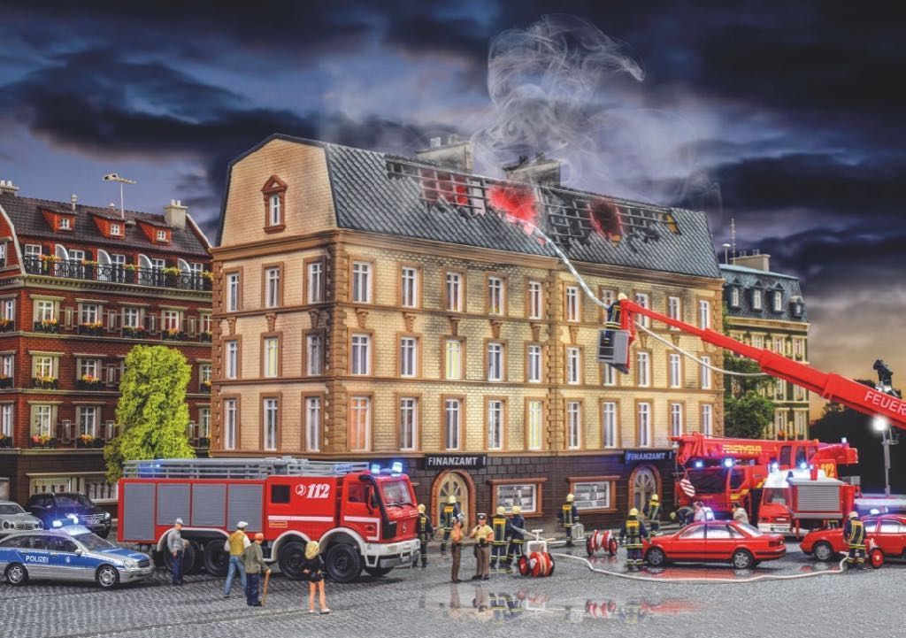Das Finanzamt brennt! Menschen kommen natürlich nicht zu Schaden, aber sind alle Datenbestände gesichert? Der Bausatz besteht aus dem Finanzamt, einem roten Flackerlicht, Farbtabletten und einem Rauchgenerator Art. 44112 für ca. 60 Minuten Brenndauer. Verwenden Sie das Viessmann Dampfdestillat Art. 6850 zum Betrieb des Rauchgenerators. Maße: L 26,5 x B 10,5 x H 18,5 cm.