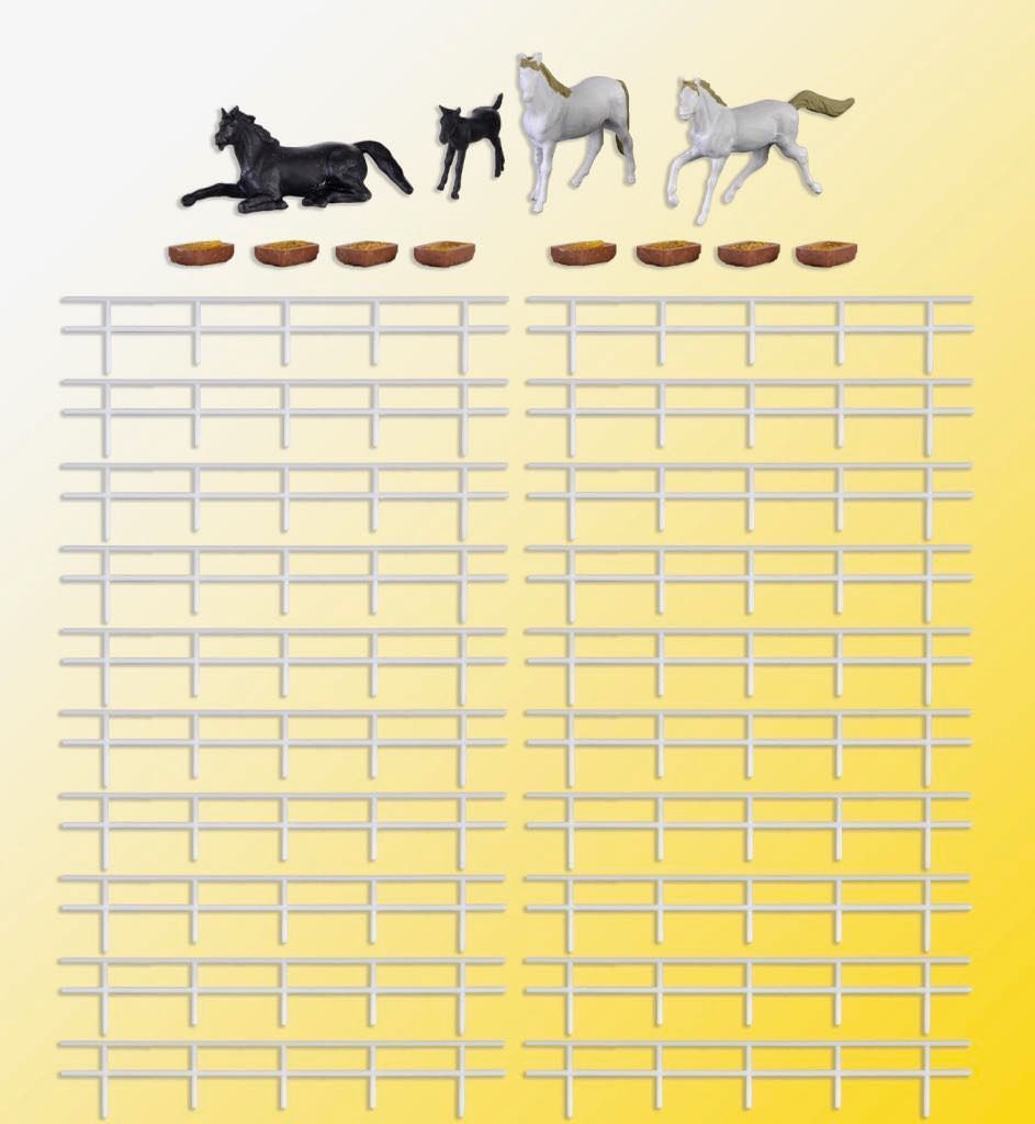 4 Pferde liegen dem Bausatz bei. Das Dach des Stalls ist abnehmbar. So kann das Innere nach Belieben gestaltet und verändert werden. Maße: L 17 x B 8,5 x H 6,5 cm, Zaun L 180 x H 1,4 cm.