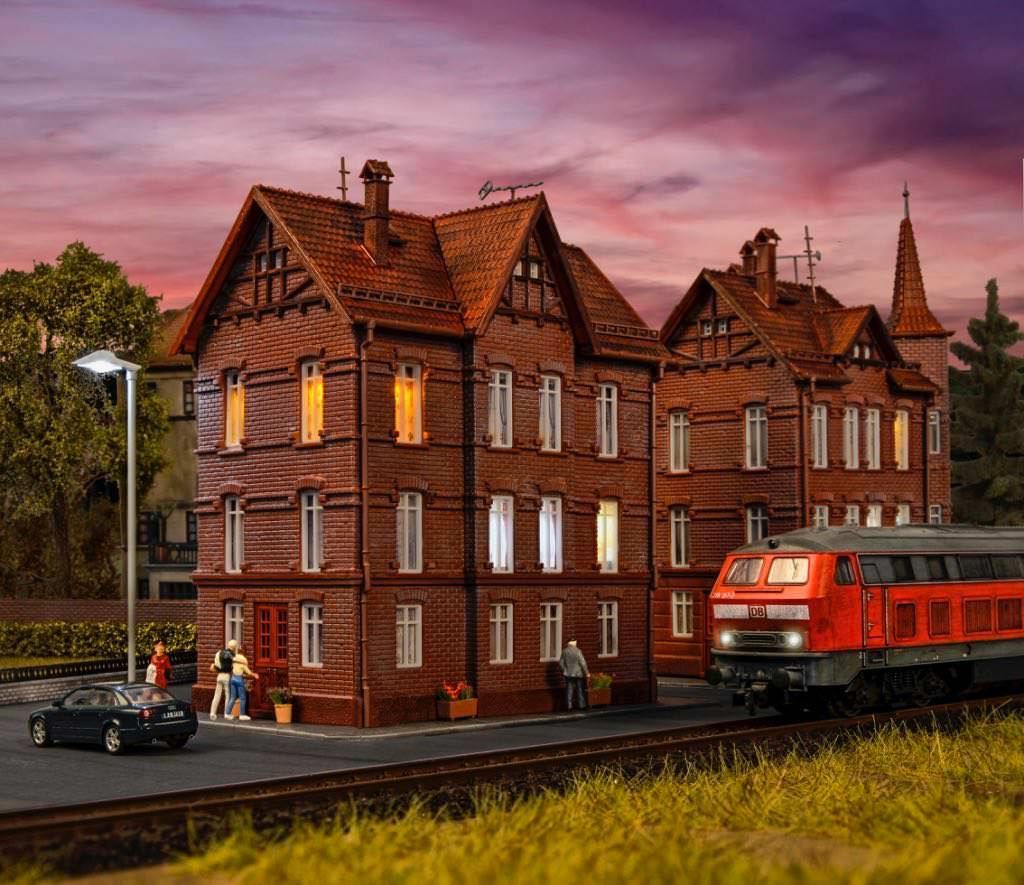 Die Eisenbahner-Wohnhäuser sind stattliche Gebäude aus der Zeit um die Wende zum 20. Jahrhundert. Durch die Backsteinbauweise wirken die Häuser rustikal und gleichzeitig spürt man die Romantik des Industriezeitalters. Die günstigen Wohnungen für Bahnangestellte waren und sind in der Nähe der Gleisanlage positioniert. Der rote Backstein ist nicht nur in Norddeutschland zu Hause, sondern wurde aufgrund der hohen Beanspruchbarkeit überall eingesetzt. Mit den Wohnhäusern Art. 43805 – 43807 können interessante Eisenbahner-Wohnviertel gestaltet werden. Maße: L 13,2 x B 9,3 x H 16,5 cm.