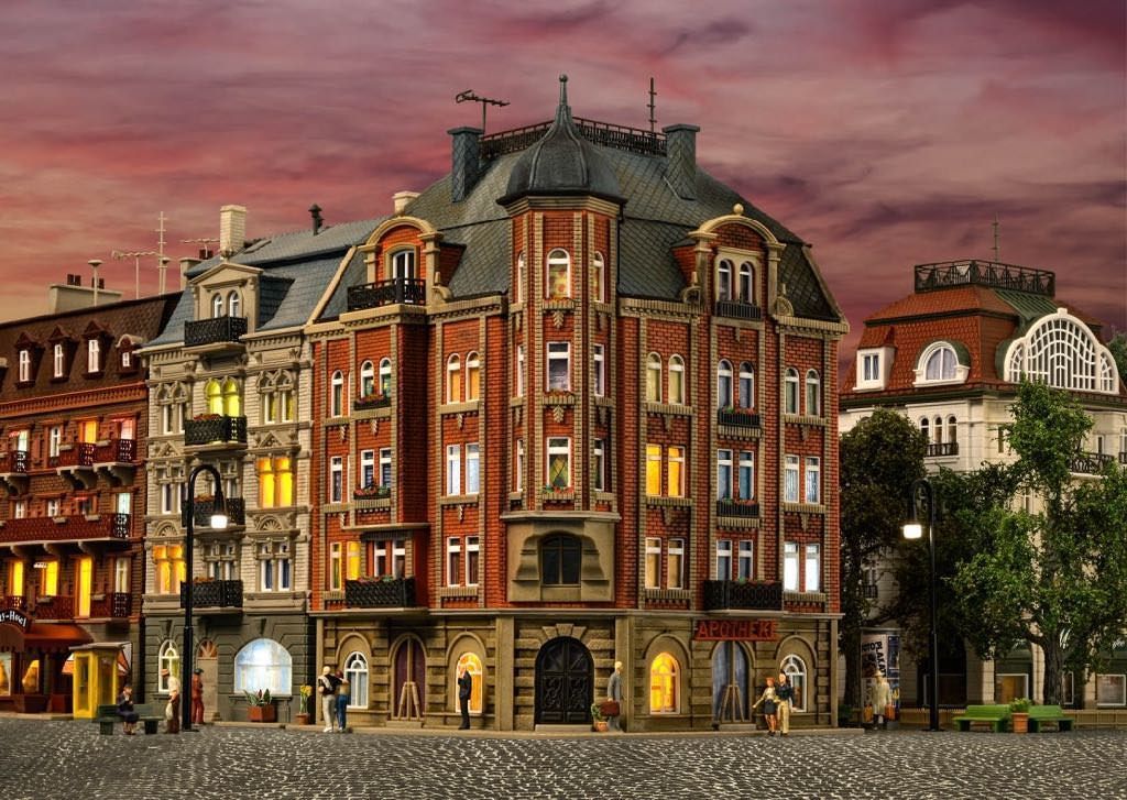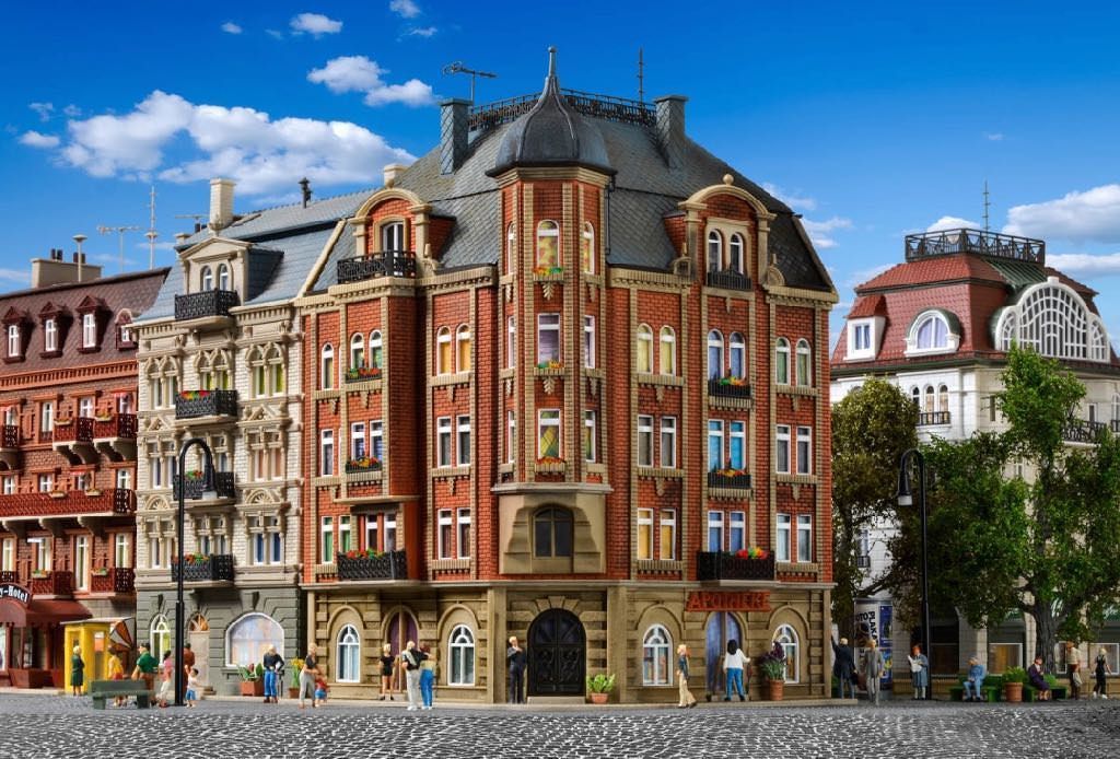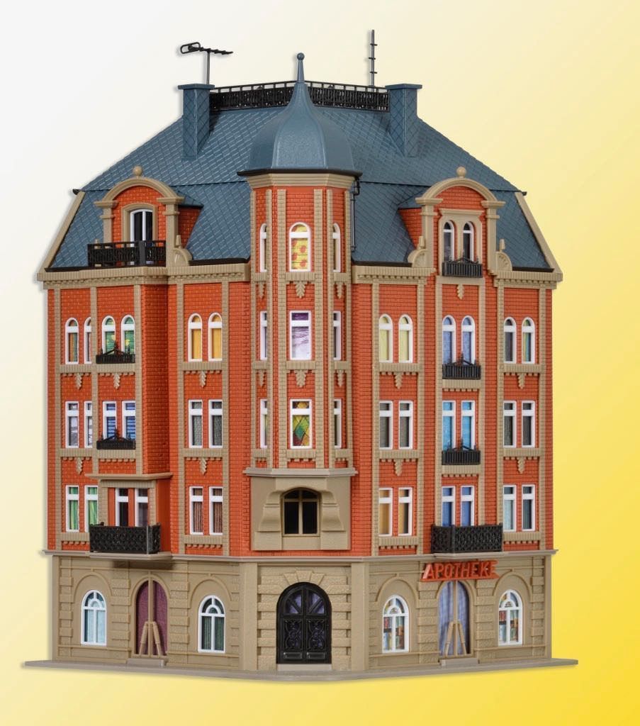 Die Gebäude der Schlossallee sind besonders hochwertige Architekturmodelle und genügen höchsten Modellbauansprüchen. Alle Häuser dieser Serie sind mit vielen Details ausgestattet, z. B. Eisengitterverzierungen, zierlichen Balkonen, Stuckfassaden und vielem mehr. Die Schlossallee besteht aus dem Eckhaus, dem Wohnhaus Art. 43813 und dem Haus am Park Art. 43815. Das Eckhaus ist ein stattliches Stadthaus und als Anfangs- und Endpunkt ganzer Straßenzüge ideal geeignet. Maße: L 14 x B 14 x H 22,5 cm.