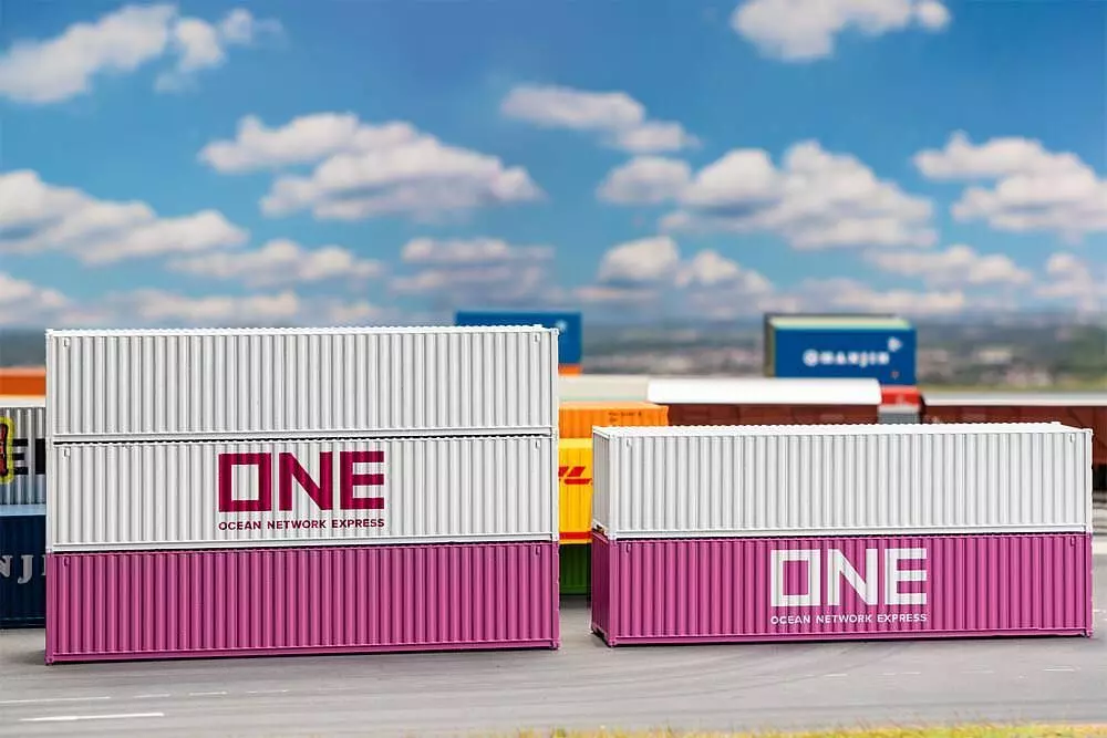 5er-Set mit 40' Container-Bausätzen. Zwei Modelle mit Digitaldruck-Labeling des Unternehmens »ONE«.
