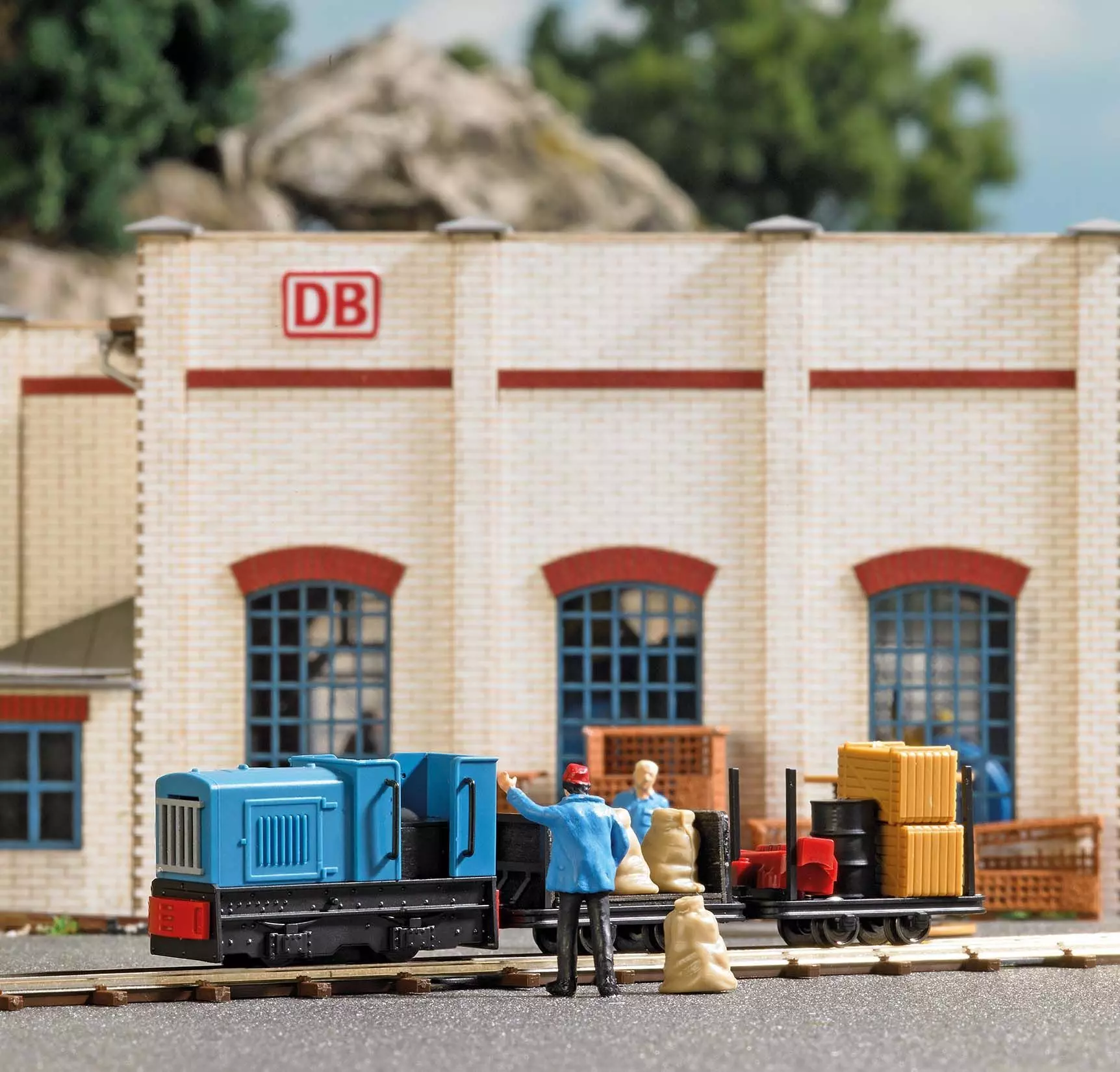 Besonders preisgünstiges Einstiegs-Set. Inhalt: Feldbahndiesellokomotive Gmeinder 15/18 PS in offener Ausführung mit Rungen- und Stirnwandwagen. Gleise und Batteriekasten für 2 Batterien LR6/AA (nicht enthalten) und Schalter (Vorwärts/Rückwärts/Stopp).