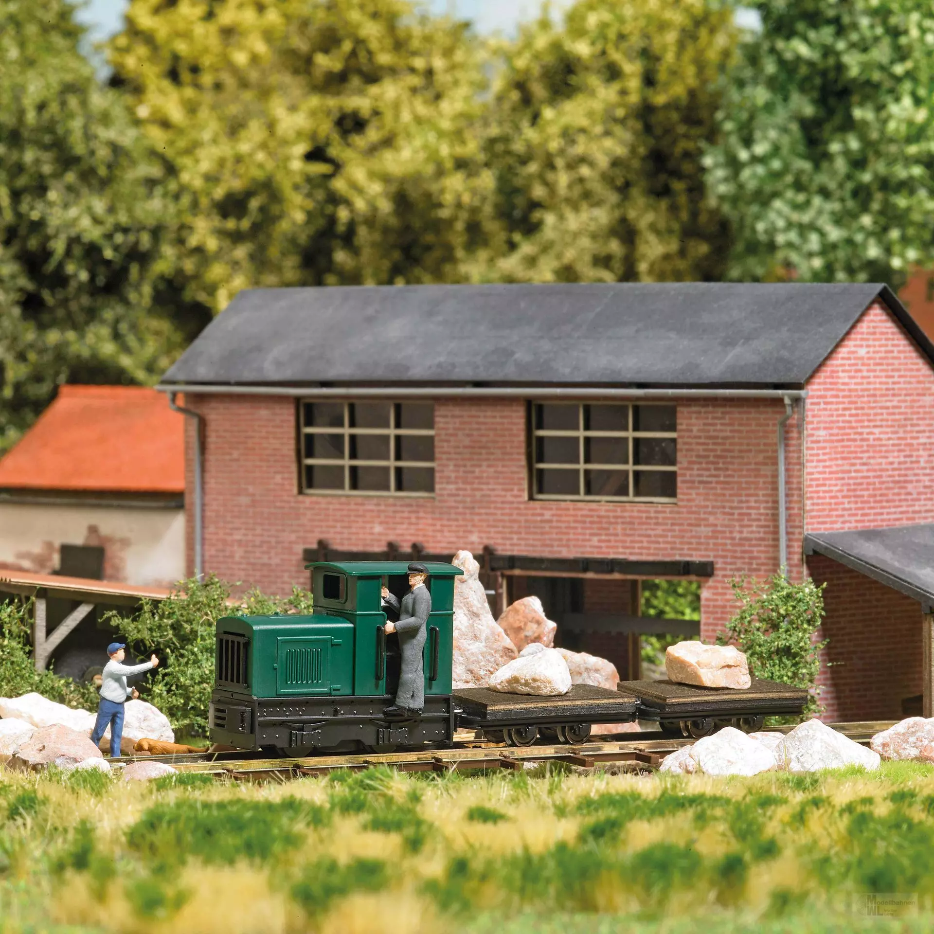 Feldbahndiesellokomotive Gmeinder 15/18 in geschlossener Ausführung und 2 Transportwagen beladen mit Felsbrocken. Wagenböden aus echtem Holz. Inklusive Gleisen, Batteriekasten (für 2 Batterien LR6/AA, nicht enthalten) und Schalter (Vorwärts/Rückwärts/Stopp)