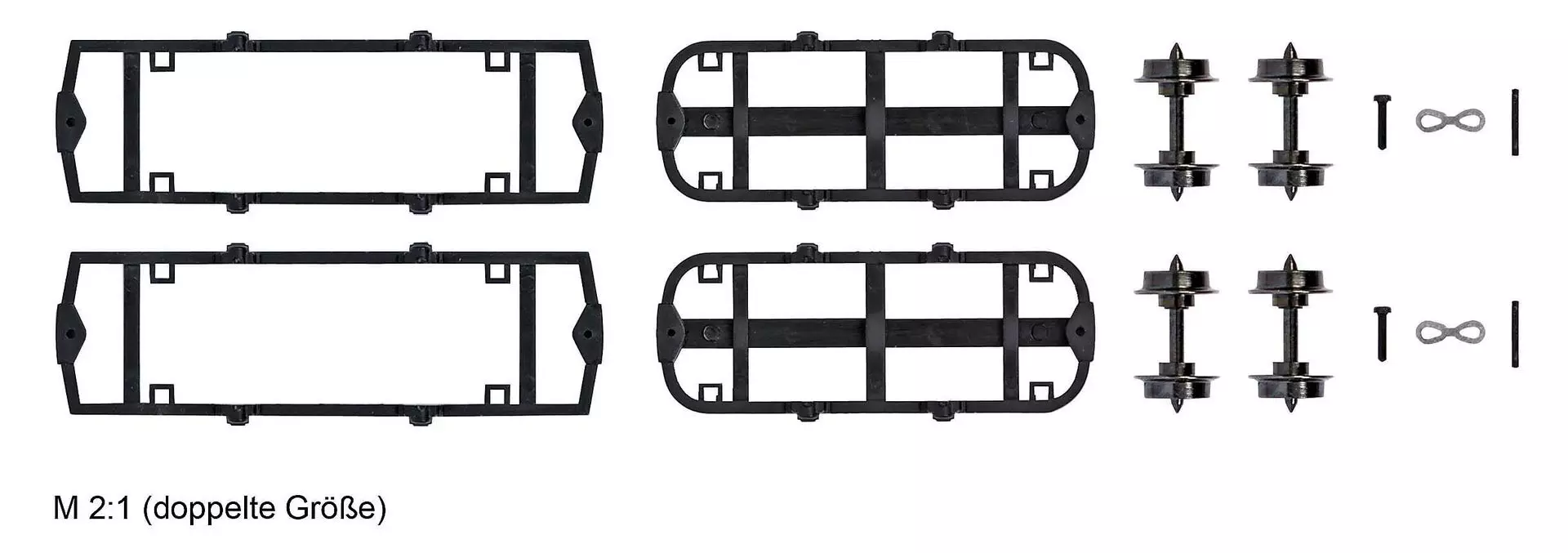 2 Fahrwerke (Bausatz) für den Bau von wahlweise 2 langen oder 2 kurzen (oder je 1 langer und kurzer) Feldbahnwagen mit individuellem Aufbau oder als Ersatzfahrwerke. Mit dunkel brünierten Metallradsätzen und Kupplungen. Langes Fahrwerk: 36 mm, kurzes Fahrwerk: 29 mm lang.