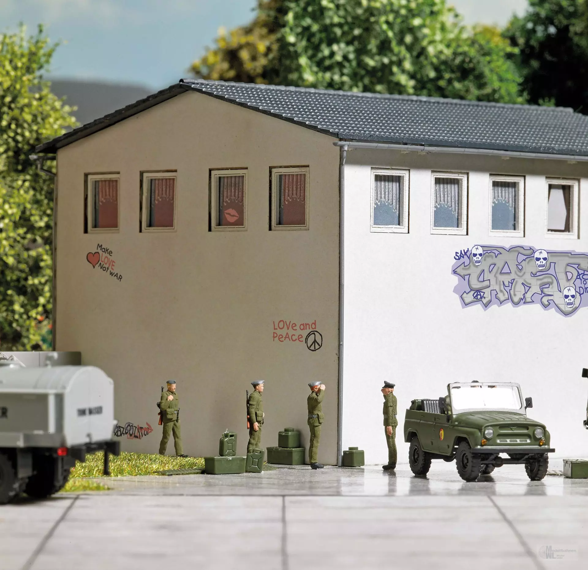 4 stehende NVA-Soldaten, fertig bemalt. Mit Werkzeugen, Ölfass, Bomben, Kanister und Sandblechen.