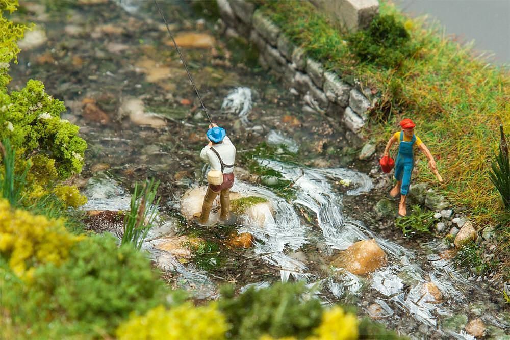 Ein neu gestalteter Bach plätschert über die Modelleisenbahnanlage und sorgt für eine äußerst entspannte Atmosphäre. Der Klang erklingt als ununterbrochene Schleife, solange die Stromversorgung gewährleistet ist. Anschluss: 12 V, Gleichspannung.
