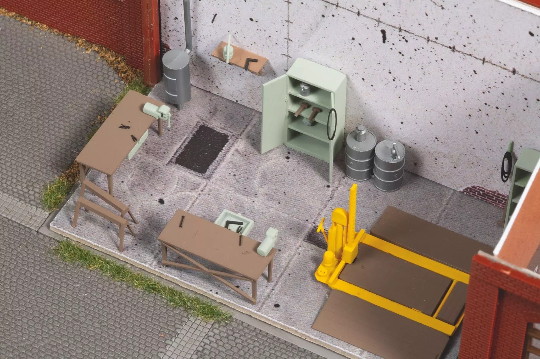 Dieses Grundmodell aus dem AuhagenBaukastensystem enthält umfangreiches Zubehör für die Gestaltung einer kleinen Autowerkstatt. Da das Tor auch geöffnet montiert werden kann, ist die umfangreiche