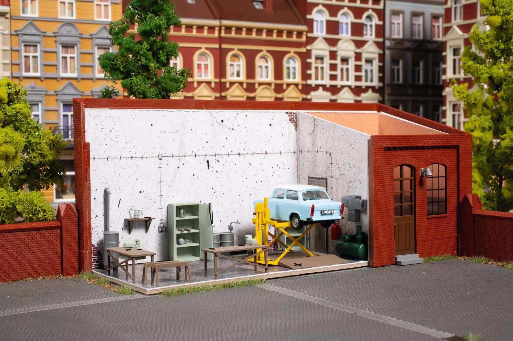 Inneneinrichtung gut zu sehen: so z.B. Werkbänke mit Schubkästen und Schraubstöcken, Stahlschränke und Regale, ein Kompressor mit Zubehör, einzelnes Werkzeug u. v. m. Die zusätzlichen Innenwände und der Boden sind aus bedrucktem Karton realistisch gestaltet. Besonderer Blickfang ist die fahrbare Scherenhebebühne (vom VEB Hebebühnen Lunzenau) mit max. 2 t Tragkraft. Die Auffahrrampe im Außenbereich, deren Spurweite variabel gebaut werden kann, steht z.B. für die Unterbodenpflege zur Verfügung. Mehrere Fässer, auch verbeulte, mit Schmierund Pflegemitteln zeugen von einer guten