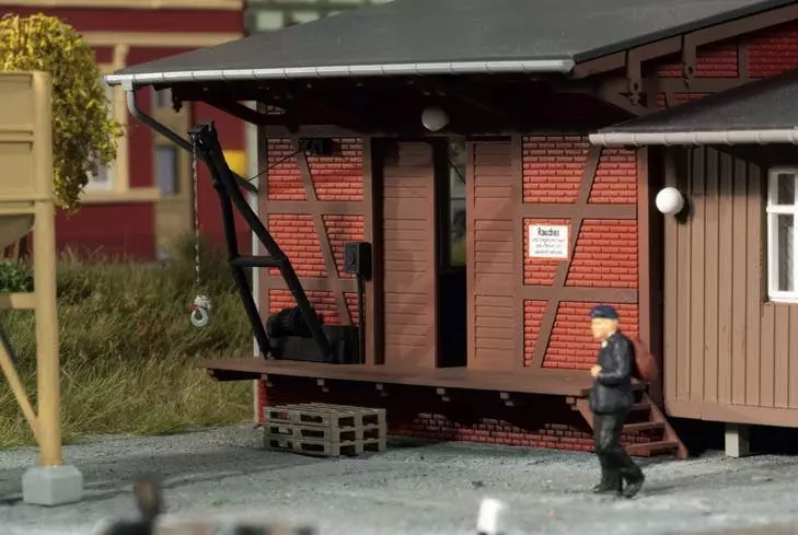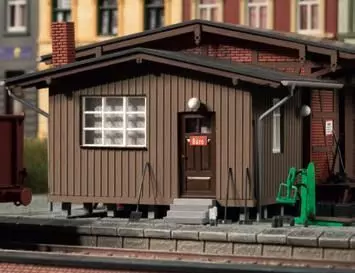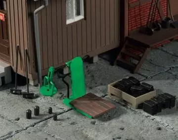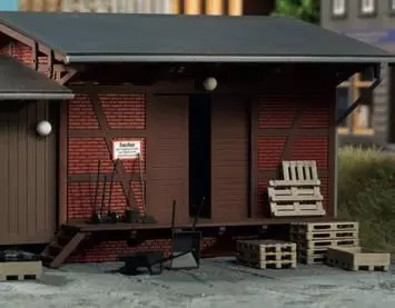 ist. Das Klinkerfachwerkgebäude wird durch einen holzverschalten Büroanbau ergänzt. Für die Ausgestaltung liegen dem Bausatz Werkzeuge, wie z.B. Schaufeln, Besen und Schubkarren sowie Brikettstapel und Paletten bei.