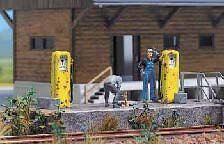 Diesel-Tankstelle für die Betankung von ländlichen Nutzfahrzeugen auf Bauernhöfen, zum Betanken von Diesel-Loks auf Güterbahnhöfen, als Industrietankstelle u.ä. geeignet. Bausatz mit 4 Zapfsäulen, großem Dieseltank, Podest mit Treppenaufgang, Ölfässer, Kanister, Wellblechhütte und Werkzeug.