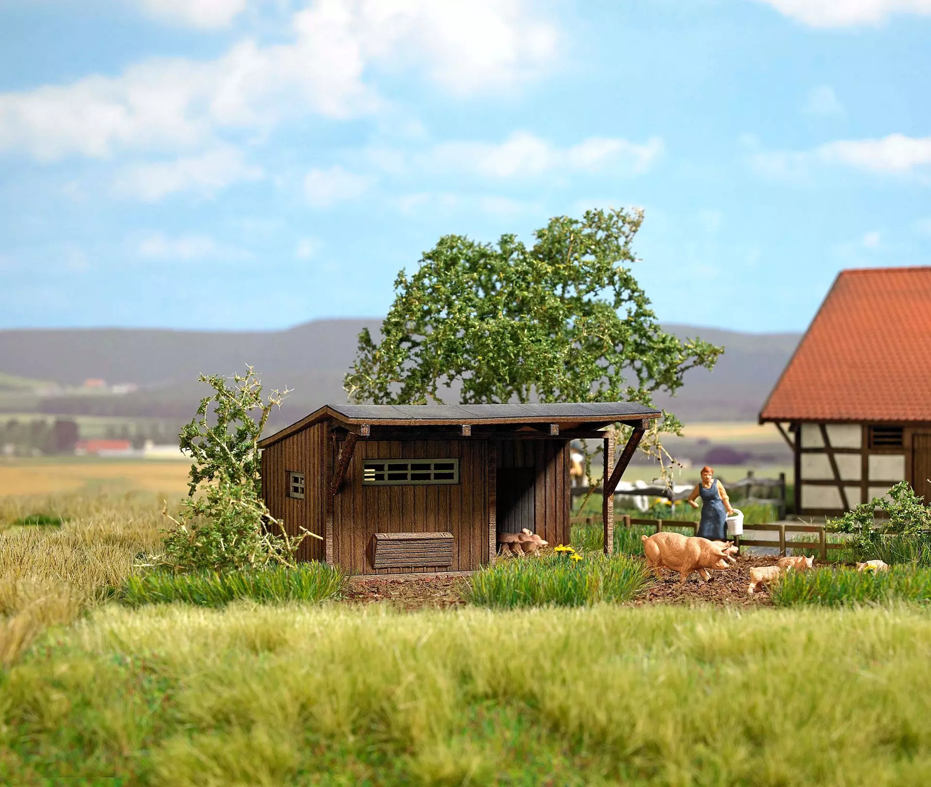 Typischer Schweinestall in Echt-Holz-Bauweise, alle Teile fertig koloriert. Das Original steht im Freilichtmuseum Neuhausen ob Eck (in der Nähe von Tuttlingen). Der Dachüberhang an der Vorderseite gewährt die witterungsgeschützte Futteraufnahme am Trog. Seitlicher Eingang mit Holzboden, der von den Schweinen bei gutem Wetter gerne als »Sonnenterrasse« genutzt wird.