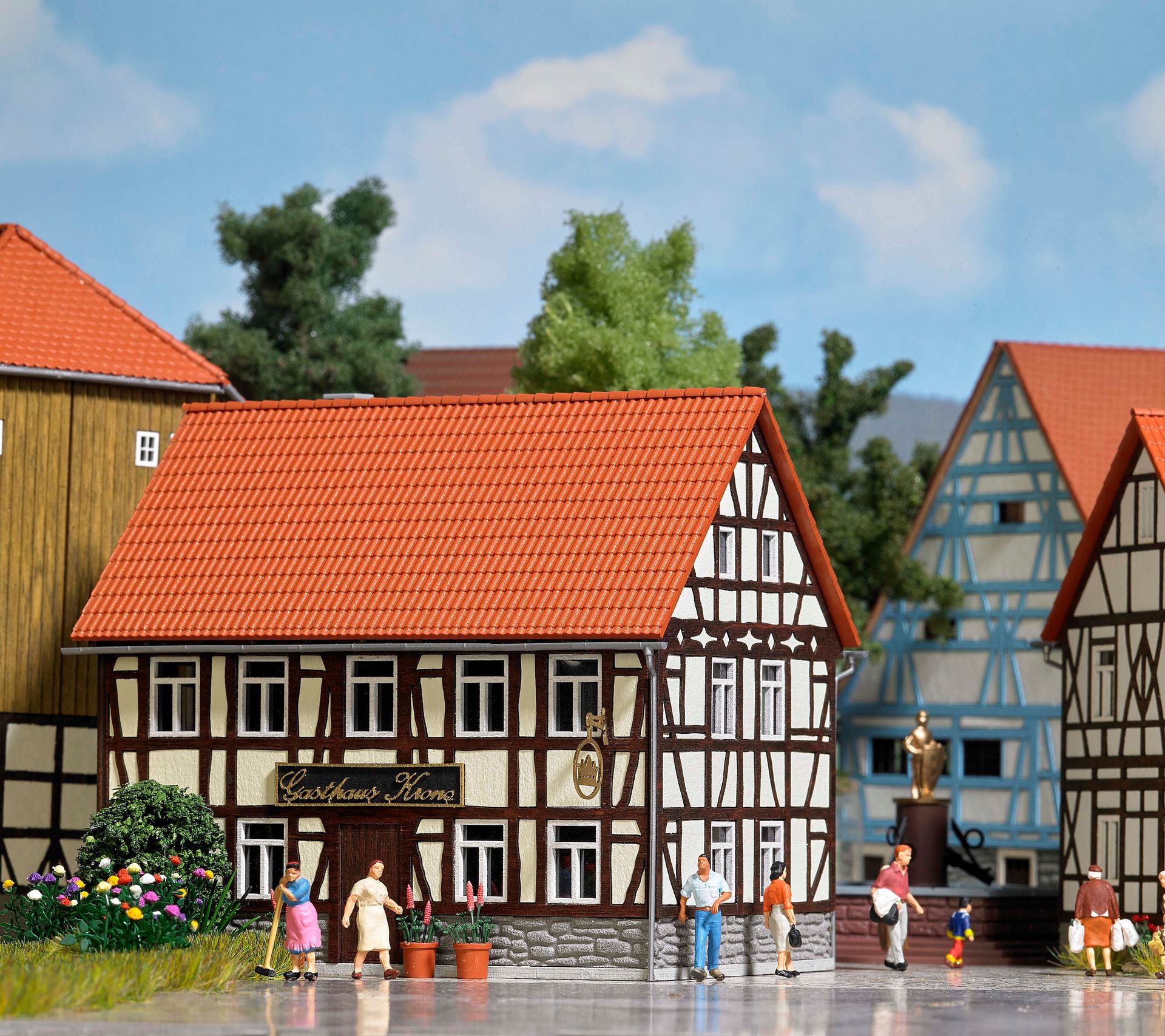 Bausatz für einen urigen Landgasthof mit schön ziseliertem und realistisch gebogenen Holzfachwerk und Putzgefachen. Bereits fertig koloriert. Komplette Holzverkleidung der Gebäuderückseite mit Anbau sowie Dachfirst. Eingangstür aus echtem Holz. Mit filigranem Wirtshausschild.