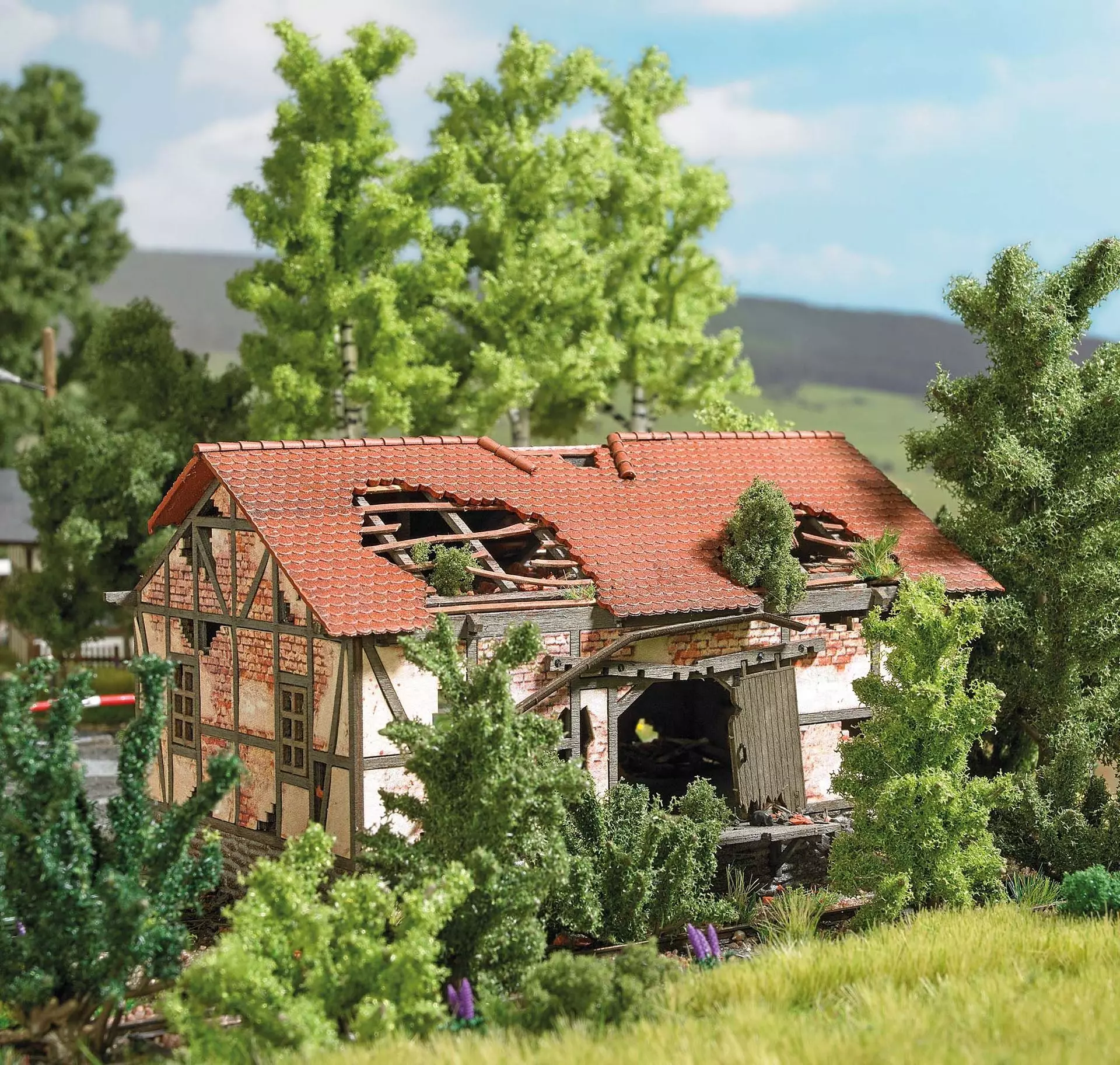 Bausatz für einen zerfallenen Güterschuppen in Fachwerkbauweise. Mit verwitterter Fassade, in der das Mauerwerk unter dem bröckelnden Putz zu sehen ist. Durch das zerbrochene Ziegeldach ist der Dachboden zu erkennen. Fachwerk, Dachgebälk, Dachgiebel, Dachboden, die Güterrampen an den Längsseiten des Gebäudes sowie die Tore, die schief in den Angeln hängen, sind aus echtem Holz. Alle Teile fertig koloriert. Bausatz.
