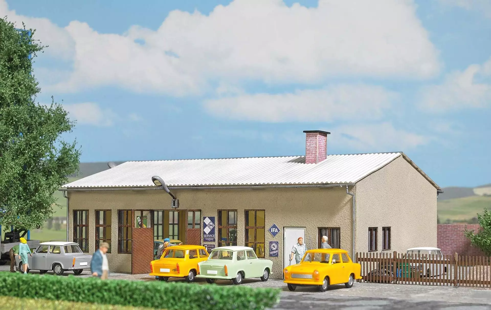 Typische Werkstatthalle nach ostdeutschem Vorbild. Realistische Darstellung des Mauerputzes in Optik und Haptik. Fenster und Hallentor (32 x 33 mm) aus echtem Holz. Alle Teile fertig koloriert. Mit filigranen Regenrinnen und Fallrohren sowie 2 Ansatzleuchten der Bauart »LBL« (ohne Funktion). Ausschneidebogen mit passenden Werbeschildern enthalten. Halle beleuchtbar mit Busch LEDs 5998. Bausatz.