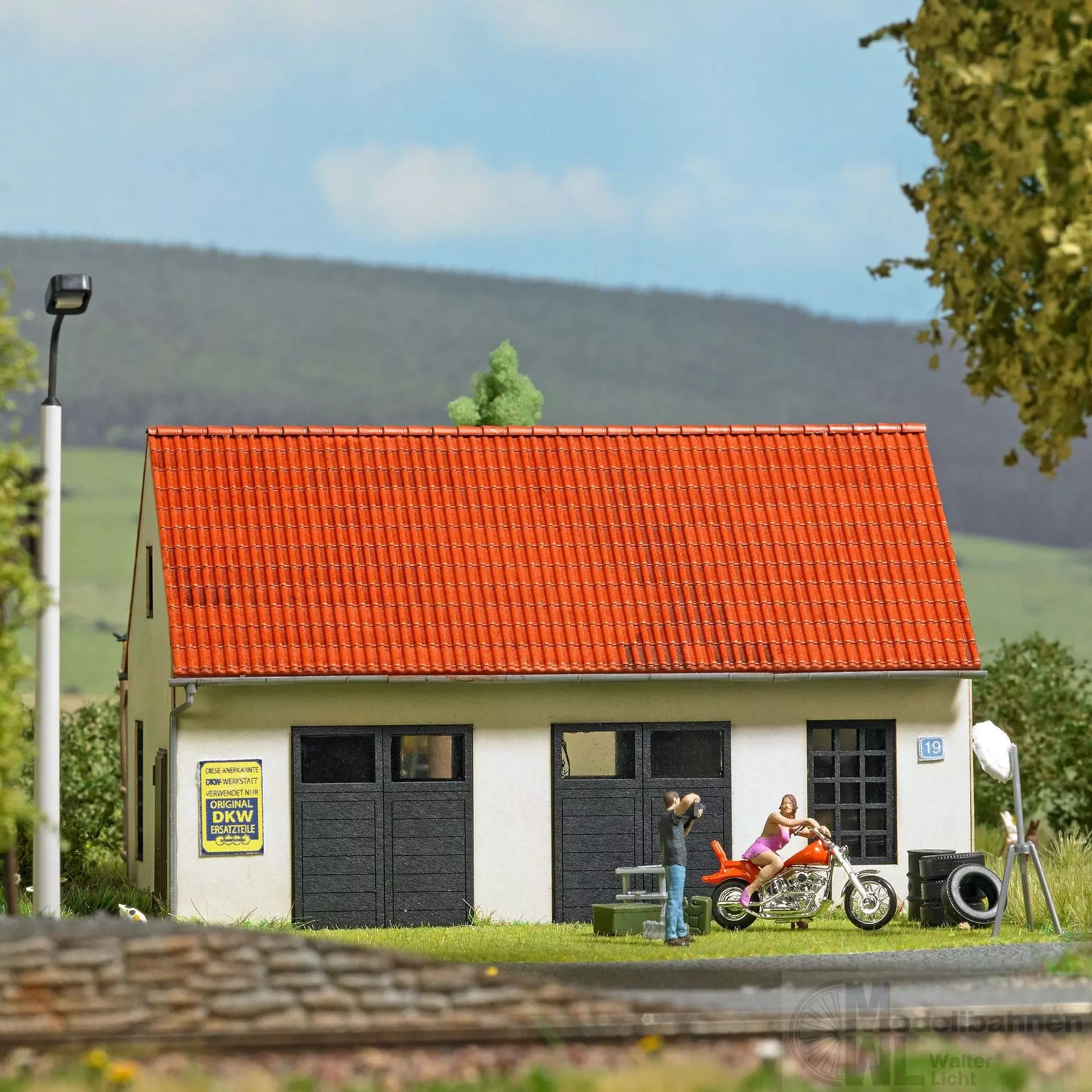 Dieses Gebäude ist universell als Werkstatt oder für Handwerks- und Industriebetriebe einsetzbar. Klassische Bauweise mit Giebeldach und Hauswänden in leicht verwitterter Putzoptik. Türen, Fenster und beide Tore (Öffnung Tore jeweils 25 x 29 mm) aus echtem Holz, bereits fertig koloriert. Mit filigranen Regenrinnen und Fallrohren aus Kunststoff. Beleuchtbar mit Busch LEDs 5998. Bausatz. Größe: 112 x 80 mm, Höhe: 71 mm.