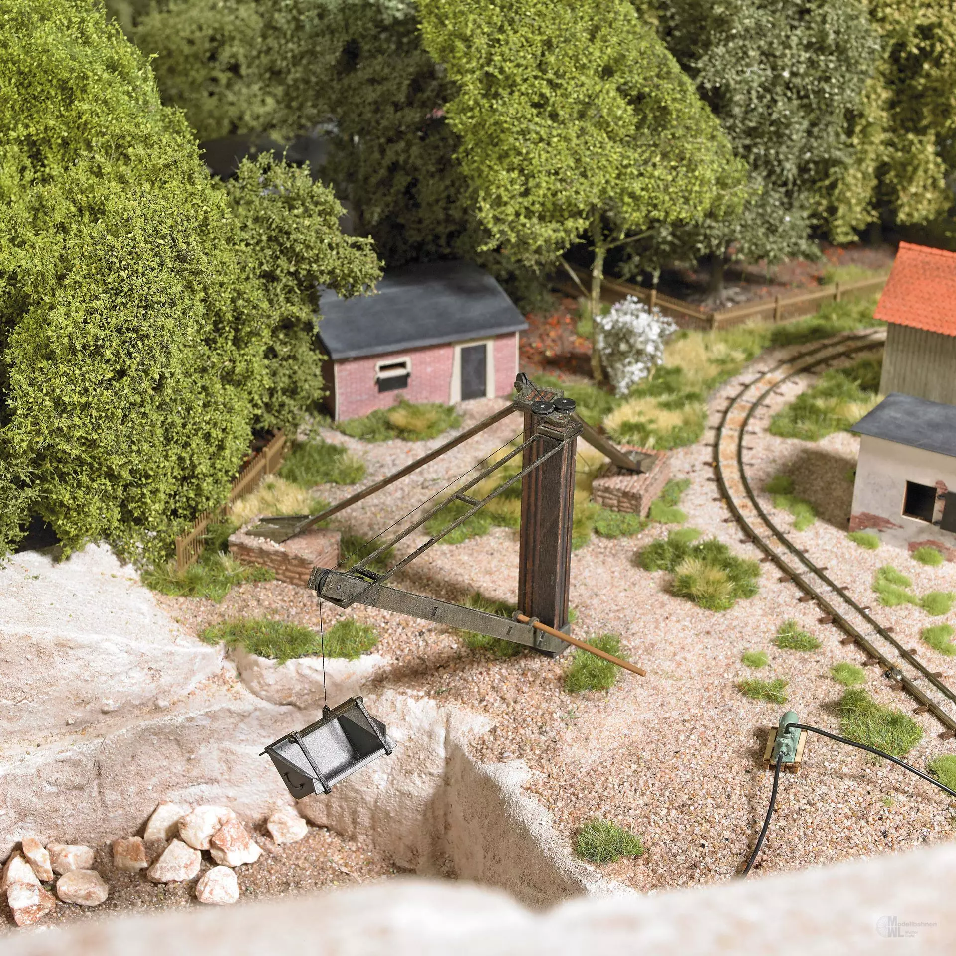 Das Original dieses Bausatzes befindet sich im Schausteinbruch Häuselloh im Fichtelgebirge (www.enklselb.com). Mit dem Schwenkkran wurden die schweren, aus den Bruchwänden gelösten Steinblöcke an den oberen Bruchwang transportiert, um auf Loren verladen zu werden. Die Stützen und Ausleger des Krans bestehen aus echtem Holz. Die beiden Stützen liegen auf realistisch nachgebildeten Steinsockeln auf. Der Ausleger mit dem Hunt ist um 270o Grad schwenkbar. Die Fassade vom