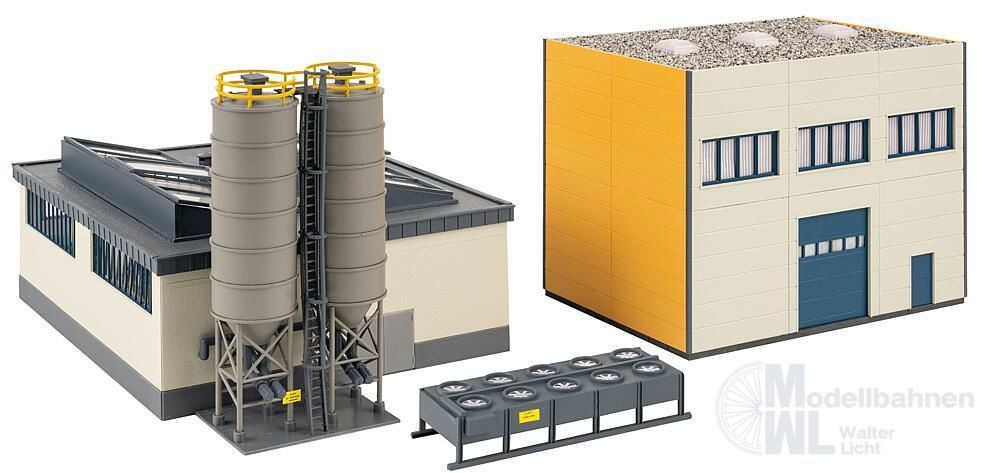 Produktionshalle, Kühlgebläse, zwei Silos und eine Lagerhalle mit Büro ergeben für sich ein geschlossenes und interessantes Industriethema für die Landschaftsgestaltung auf einer Modelleisenbahnanlage. Die Produktionshalle ist gut einsehbar und lässt den Blick frei auf reichlich Zubehör, insbesondere den gut ausgestatteten Maschinenpark mit Spritzgießmaschinen. Maße (L x B x H): 175 x 148 x 78 mm, 94 x 34 x 19 mm, 60 x 42 x 135 mm, 152 x 104 x 125 mm Epoche: IV