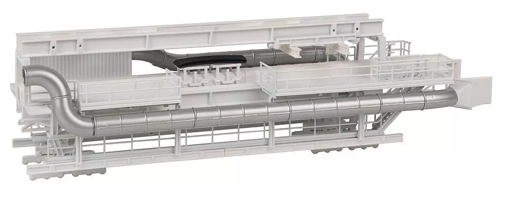 Varianten-Kit! Standmodell eines von einer »Gripper-TBM« Tunnelvortriebsmaschine gezogenen Nachläufers mit diversen Förderanlagen, Vorrichtungen und Maschinen für den Tunnelbau, Trafos, Pumpen, Equipment-Containern und Steuereinheiten. Der Bausatz kann in verschiedenen Varianten aufgebaut werden.