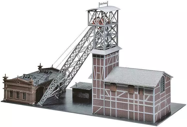 Eine Kohleförderanlage mit Schachthalle und doppeltem Förderturm mit zwei Seilscheiben, die durch Zukauf des FALLER-Motors 180629 (12–16 V, Wechselspannung) angetrieben werden können. Motor liegt nicht bei. Das Fördermaschinenhaus mit Geräteschuppen und angebautem Öllager ist ebenfalls enthalten.