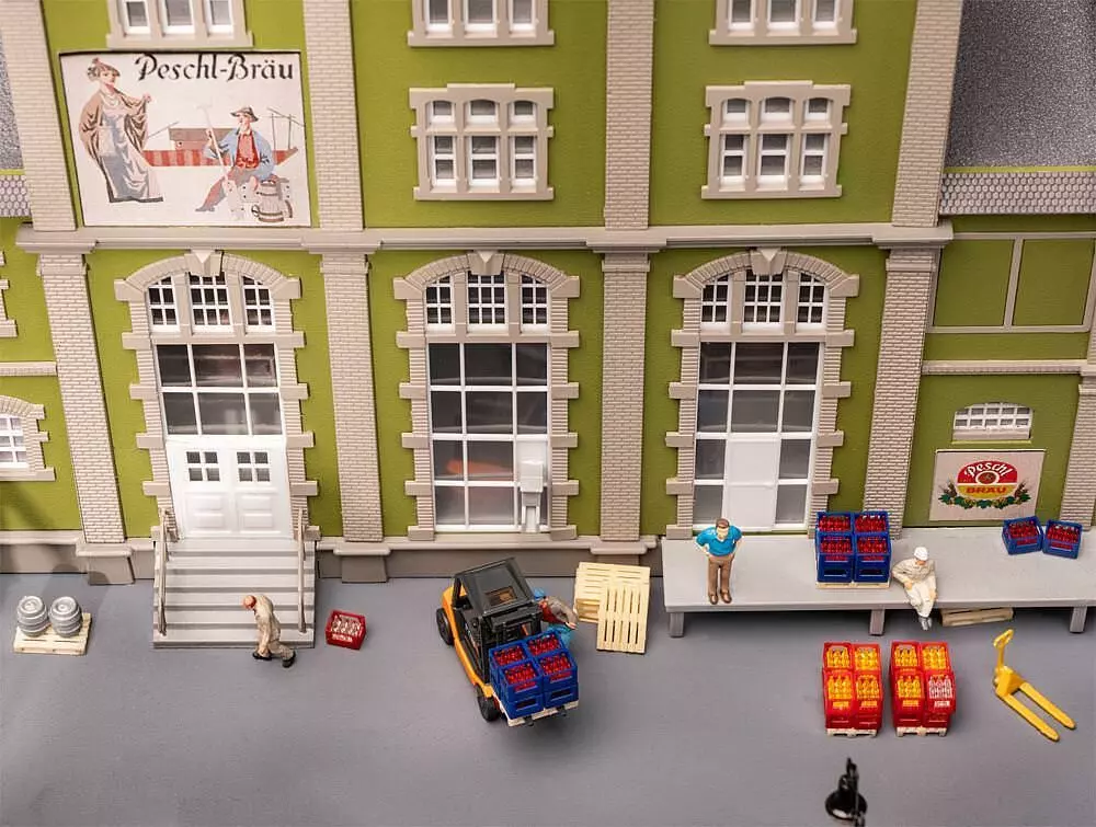 Repräsentatives Brauereigebäude mit dekorativen Zinnen und Turmerkern im Stil der Gründerzeit. Das zentrale Sud- und Maschinenhaus flankieren zwei seitliche Gewerbeanbauten. Eine Laderampe, ein rückseitig angebauter Schornstein, vier kupferfarbene Sudkessel für die Innenausstattung und Dekos der niederbayerischen Peschl-Brauerei komplettieren das Modell.