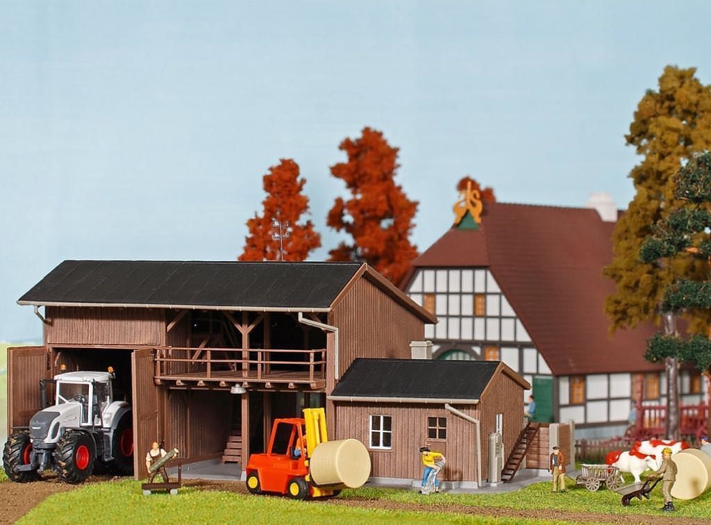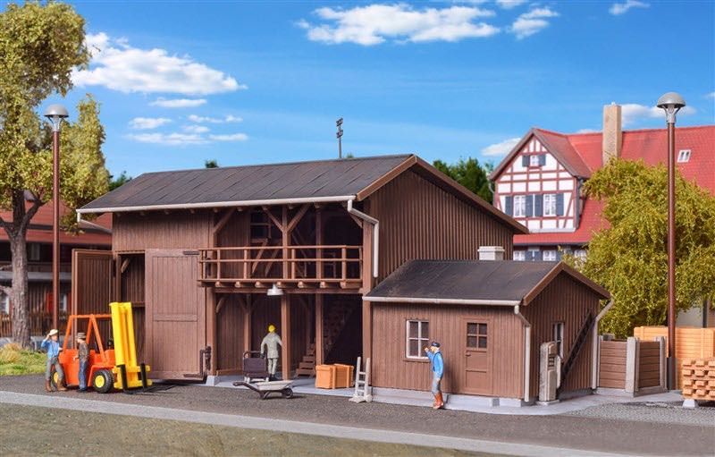 Bausatz. Maße: Schuppen: L 21,5 x B 13 x H 11 cm. Stapler: L 5,3 x B 2,1 x H 3,3 cm. Schwierigkeitsgrad: 2 (Fortgeschrittene).