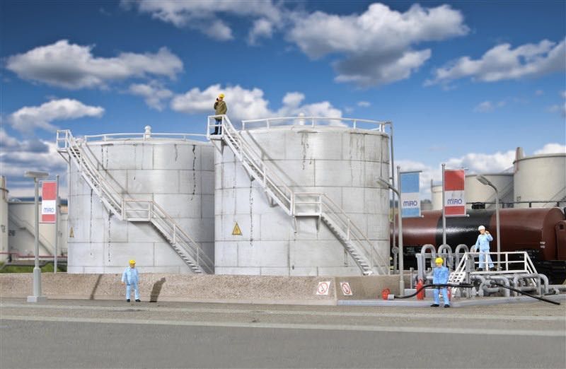 Bausatz. Die MIRO Mineralölanlage von kibri ist so konzipiert, dass sie sich aus einzelnen Bausteinen individuell zusammenstellen lässt. So lassen sich die Anlagenteile problemlos in jede beliebige Modellbahnanlage einpassen. Der angelieferte Treibstoff (z. B. leichtflüchtiges Benzin oder Rohöl) wird zur Zwischenlagerung im Hochtank Art. 39830 und der Tankanlage Art. 39832 gelagert, bevor er an der Abfüllstation Art. 39834 in den SCANIA Tankwagen gefüllt und von dort zu den Verbrauchern transportiert wird. Wie beim Vorbild stehen die Tanks auf einer undurchlässigen Lehmschicht und sind zum Schutz des Erdreichs von betonierten Wällen umgeben. Maße: L 32 x B 15 x H 10 cm. Schwierigkeitsgrad: 2 (Fortgeschrittene).