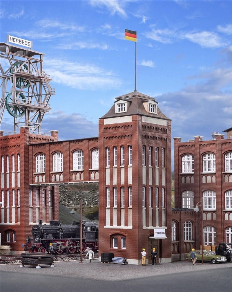 Bausatz. Dieser Verwaltungsturm der Zeche Herbede verbindet das Verwaltungsgebäude Art. 39848 mit dem Förderturm Art. 49845. Maße: L 23,5 x B 15 x H 31,5 cm. Schwierigkeitsgrad: 2 (Fortgeschrittene).
