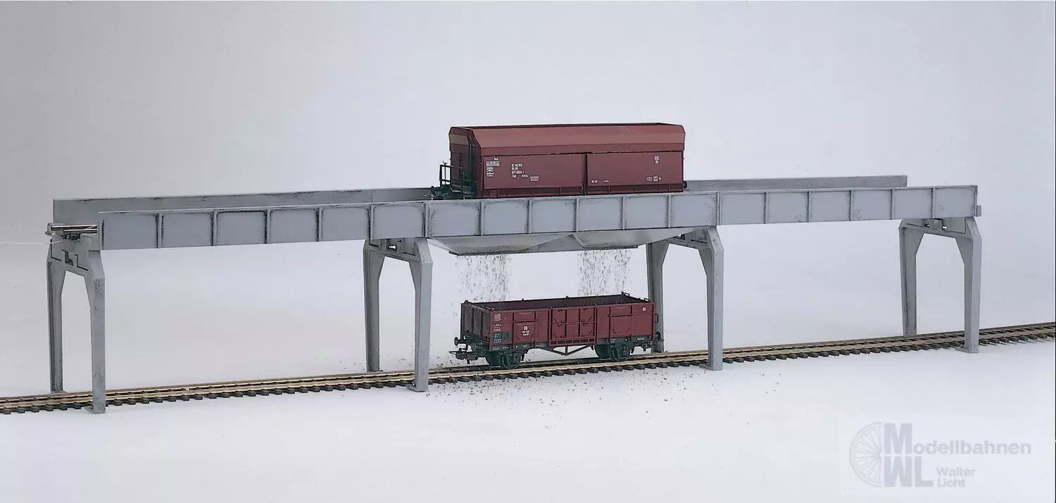 Funktionsfähige Entladebrücke als Betonnachbildung. Bei überfahren der gealterten Brücke wird der PIKO-Selbstentladewagen, selbstständig entladen. Durch Gestalten einer Unterfahrt können damit auch andere Wagen oder Lkw's beladen werden.