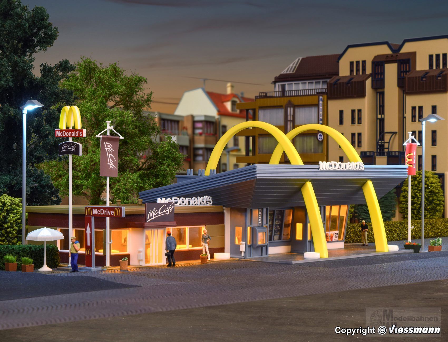 Das Modell wurde gemeinsam mit McDonald´s Deutschland entwickelt und genehmigt. Das Gebäude hat eine offene, einladende Art. Die nach hinten abgeschrägte Dachfläche und die beiden gelben Bögen, die an das Firmenlogo erinnern sollen, prägen dieses Gebäude. Durch die großen Fensterflächen fällt viel Tageslicht in den Restaurantbereich. Leckeren Kaffee und Kuchen gibt es im Anbau McCafé. Als Autofahrer erhält man seine Bestellung an den speziellen Ausgabeschaltern des McDrive. Abhängig von den örtlichen Gegebenheiten gibt es diese Art der Restaurant-Architektur in vielen Varianten. Wir bedanken uns für die freundliche Unterstützung von McDonald´s Deutschland. Mit Inneneinrichtung, 4 Sonnenschirmen, 2 Fahnen und Mast mit McDonald´s Logo. Maße: L 27 x B 15,8 x H 9,8 cm.