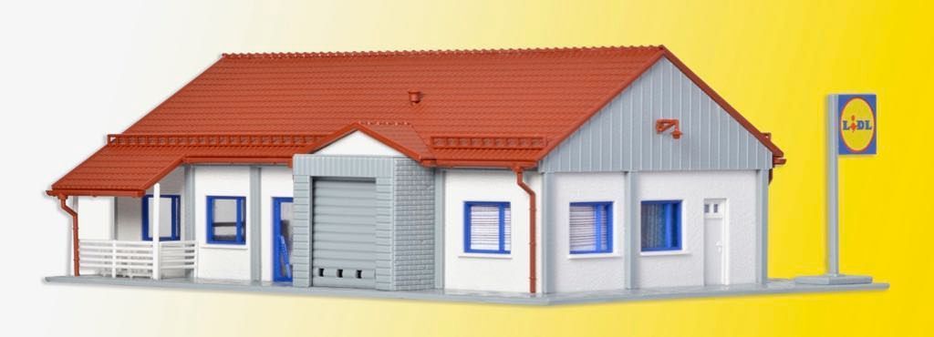 Ein Supermarkt bringt Abwechslung auf die Modellbahnanlage. Mit dem großen Schild vor dem Hauptgebäude ist der Marken-Discounter nicht zu übersehen. Der Markt ist mit einer passenden Ladeneinrichtung ausgestattet. Maße: L 20 x B 14,5 x H 7 cm.