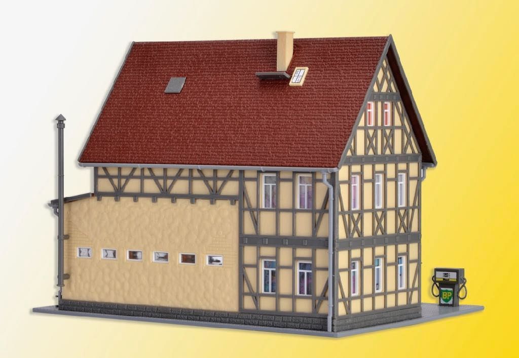 Mit Dieselzapfsäule, Hebebühne und weiterem Zubehör. Eine LED zur Innenbeleuchtung der Werkstatt liegt dem Bausatz bei. Maße: L 15,8 x B 12,5 x H 12 cm.