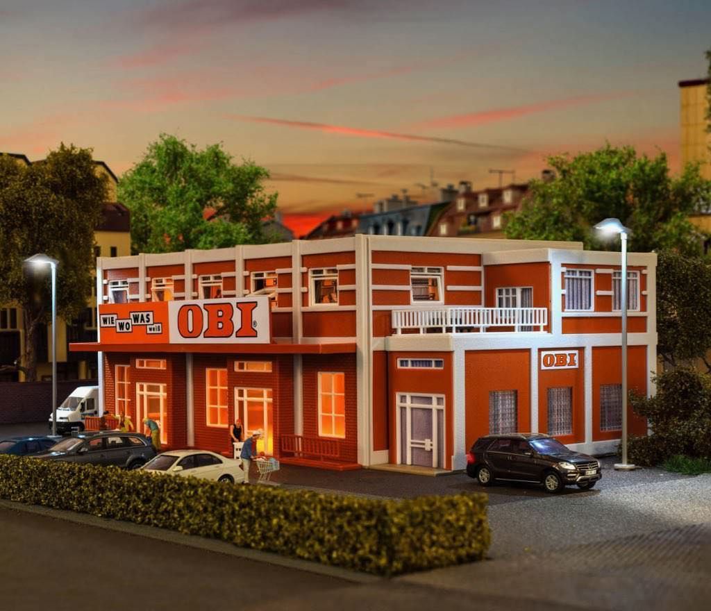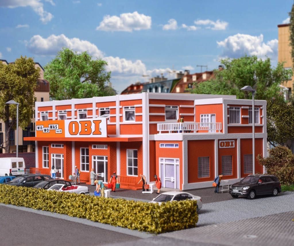 Der Trend zum Selbermachen und -bauen hält an. Alles was man dazu benötigt, findet man im Baumarkt. Unser OBI Markt strahlt in den hausüblichen Farben und es herrscht reges Treiben am Samstagvormittag. Wie, wo, was, weiß eben OBI! Der Bausatz ist mit vielen liebevollen Details ausgestattet. Wir bedanken uns für die freundliche Unterstützung von OBI. Maße: L 24 x B 19 x H 10,5 cm, Anbau L 4 x B 15 x H 9,5 cm.