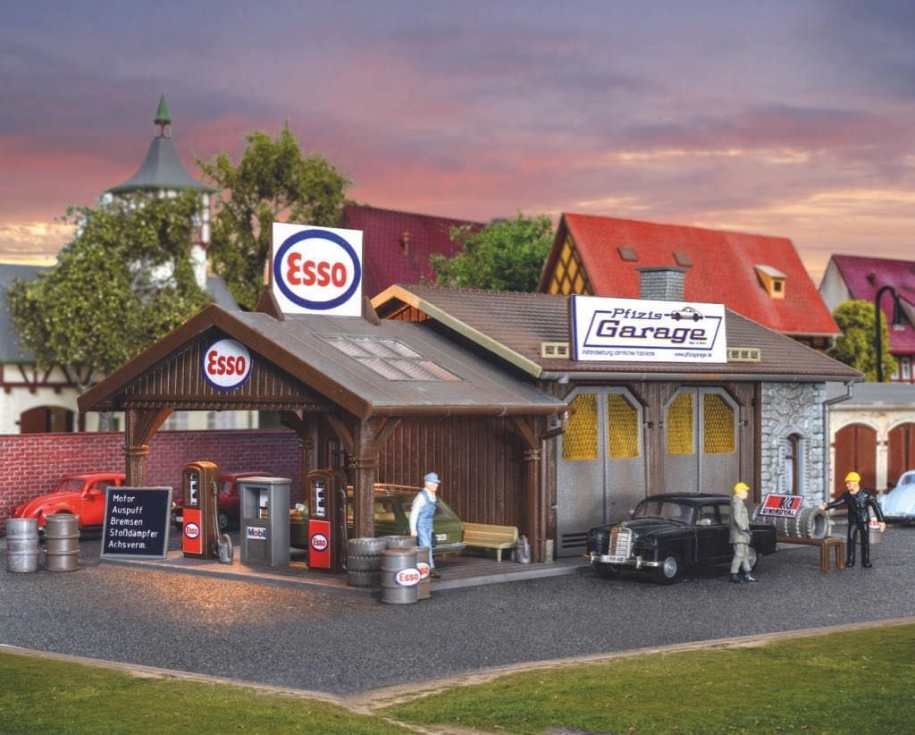Der Besitzer dieser Autoreparaturwerkstatt ist ein netter junger Mann. Er liebt Autos und ist ein absoluter Fachmann auf diesem Gebiet. Er bietet einen super Service und ist spezialisiert auf das Herrichten von Oldtimern. Pfizis Garage ist im nostalgischen Stil gehalten und passt wunderbar in Epoche III. Viele Zubehörteile liegen dem Bausatz bei und selbst eine kleine Tankstelle ist integriert. Maße: L 19 x B 10 x H 7,5 cm.