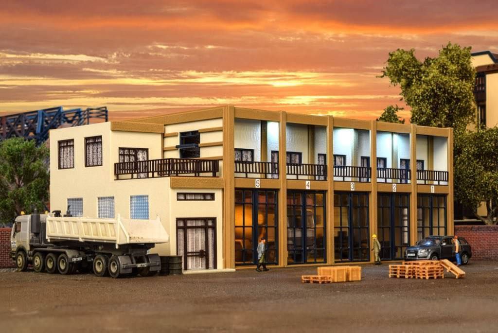 Diese Fahrzeughalle mit Flachdach ist vielseitig einsetzbar, z. B. auf einem Industrie- oder Firmengelände. Maße: Fahrzeughalle: L 24 x B 15 x H 10,5 cm. Anbau: L 4 x B 15 x H 9,5 cm.