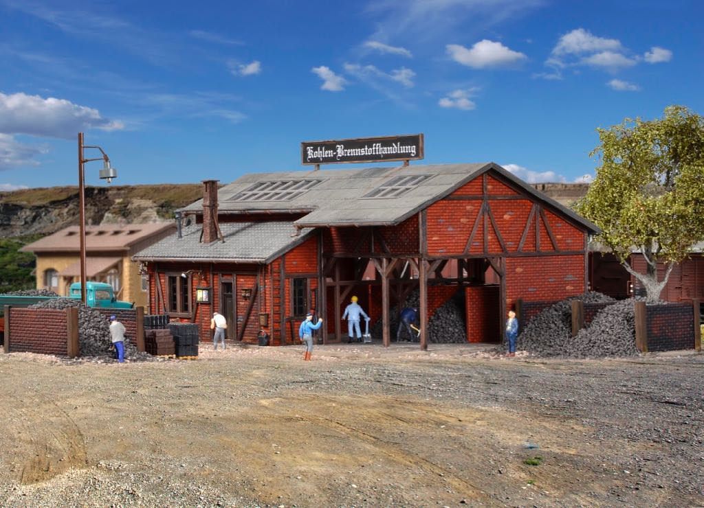 In der Kohlen- und Brennstoffhandlung wird rund um die Uhr gearbeitet. Rußgeschwärzte Gestalten verarbeiten die gerade angekommene Kohlenlieferung. Die innen- und außenliegenden Kohlebansen müssen wieder befüllt werden. In unmittelbarer Nähe zu den Gleise werden dann die Lokomotiven mit neuer Kohle versorgt. Maße: Hauptgebäude L 19,5 x B 14,5 x H 10 cm, Kohlenlager groß L 8,2 x B 4,2 x H 2,5 cm, Kohlenlager klein L 6,2 x B 4,2 x H 2,5 cm.