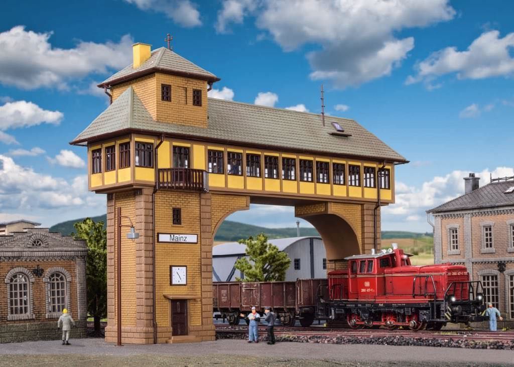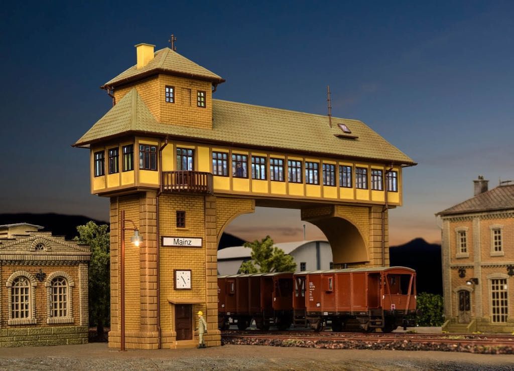 Das Reiterstellwerk besticht durch seine Form- und Farbgebung. Heller Sandstein, das Dach mit Ziegeln gedeckt, so erhebt es sich majestätisch über den Gleisen. Es überspannt 2 Gleisstrassen und die Durchfahrtshöhe ist für alle Schienenfahrzeuge geeignet. Liebevoll gestaltet ergänzt es ideal Ihren Bahnhofsbereich. Durchfahrtshöhe: 8,9 cm, Durchfahrtsbreite: 13 cm. Maße: L 23,5 x B 7 x H 18,5 cm.