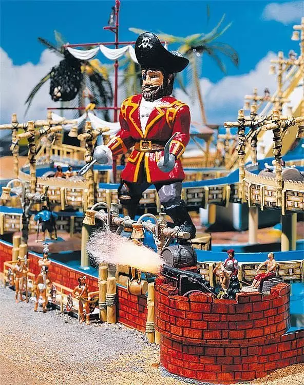Den Wasserkreislauf bewerkstelligen zwei Wasserpumpen (12-16 V, Wechselspannung). Eine riesige Figur eines Piratenkapitäns, eine originalgetreue, bunte Dekoration und das passende Kassenhaus, sorgen für die richtige Atmosphäre. Nachträglich beleuchtbar.