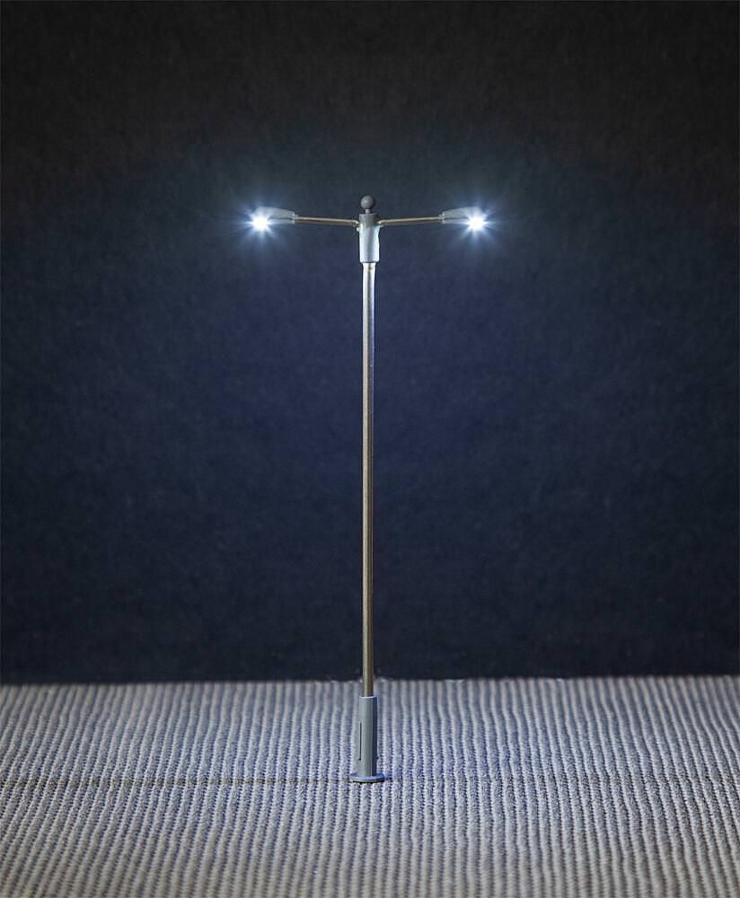 Moderne, zweiflammige Ansatzleuchte. Besonders geeignet zur Ausgestaltung von Stadt-, Straßen- und Industrieszenerien. Der Mast ist aus Metall gefertigt und die Leuchtenhöhe variabel einstellbar. Ausgestattet mit langlebiger LED-Technik. Höhe: 93 mm.
