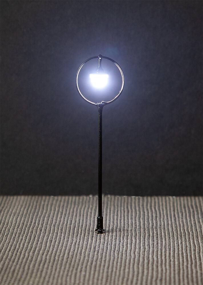 Klassische Ringleuchte mit Mast aus Metall. Besonders geeignet zur Beleuchtung von bahnnahen Szenerien, wie Bahnhöfen, Betriebswerken oder Gleisfeldern. Die einflammige Leuchte ist mit langlebiger LED-Technik ausgestattet. Höhe: 75 mm.