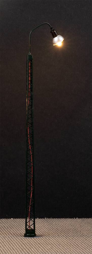 Klassische Bogenleuchte mit Gittermast aus Metall. Besonders geeignet zur Beleuchtung von bahnnahen Szenerien, wie Bahnhöfen, Betriebswerken oder Gleisfeldern. Die einflammige Leuchte ist mit langlebiger LED-Technik ausgestattet. Höhe: 145 mm.